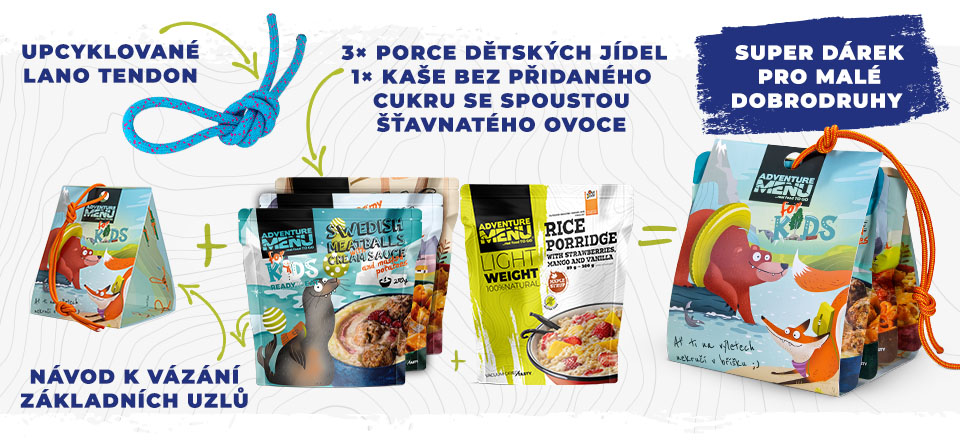 Balíček je totiž zabalený v poutavém barevném stylu a svázaný kusem upcyklovaného horolezeckého lana Tendon, kterému jsme tak dali zcela nové využítí. A zdaleka ne poslední. Až do alelujá se na něm dají trénovat základní uzly, ke kterým jsme na spodní stranu balení vytiskli přehledné návody. Ty si tak v teple domova mohou děti osvojit, ať už z nich chcete mít horolezce, nebo je prostě chcete naučit uzly využitelné v nespočtu outdoorových situací.